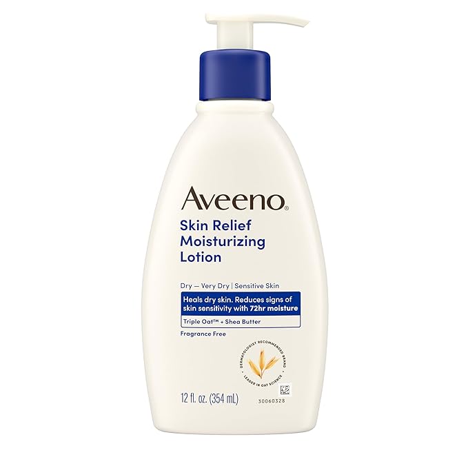 - 12-fluid ounces of Aveeno Skin Relief Fragrance-Free Moisturizing Body Lotion with a soothing triple oat and shea butter formula helps heal very dry skin and reduces signs of skin sensitivity** with 72-hour* moisture