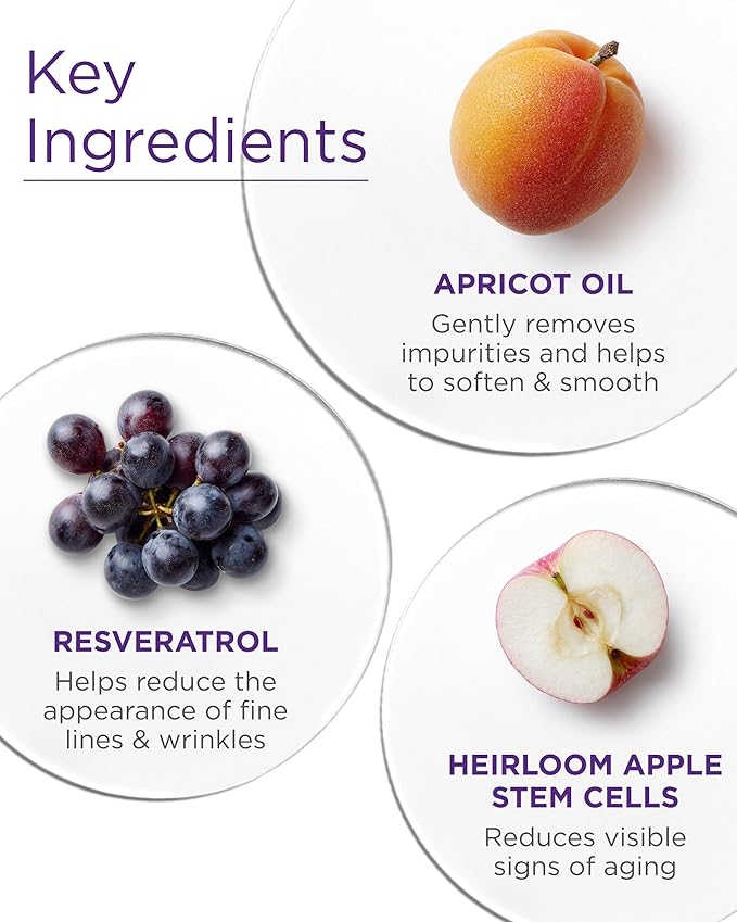 - Gentle daily cleanser: Fruit Stem Cell complex from apple & grape, Resveratrol CoQ10, and vegan probiotics gently remove makeup & impurities, rinsing away dull surface cells and balancing skin flora.
