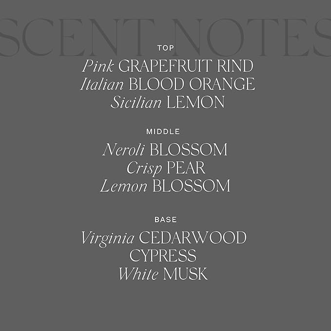 - Sparkling Citrus: Our Grapefruit fragrance captures the effervescence of citrus; pink grapefruit and Italian blood orange are the heart of this scent, while hints of neroli and pear add complexity