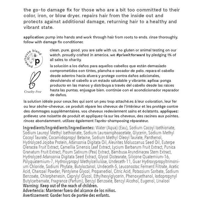 - How to Use - Apply a generous amount of this hair nourishing shampoo to wet strands. Massage into scalp to create a rich lather, then rinse thoroughly. For optimal results, follow with our Damage Fix Conditioner.