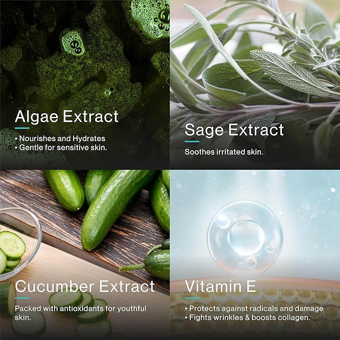 - SKIN-PERFECTING ESSENTIALS: Discover the eb5's skin-nourishing blend, featuring sea algae with anti-aging properties, sage extract, refreshing cucumber extract, and the protective strength of antioxidant vitamin E. Experience the rejuvenating power of these natural ingredients, tailored to enhance your skin's radiance and vitality.