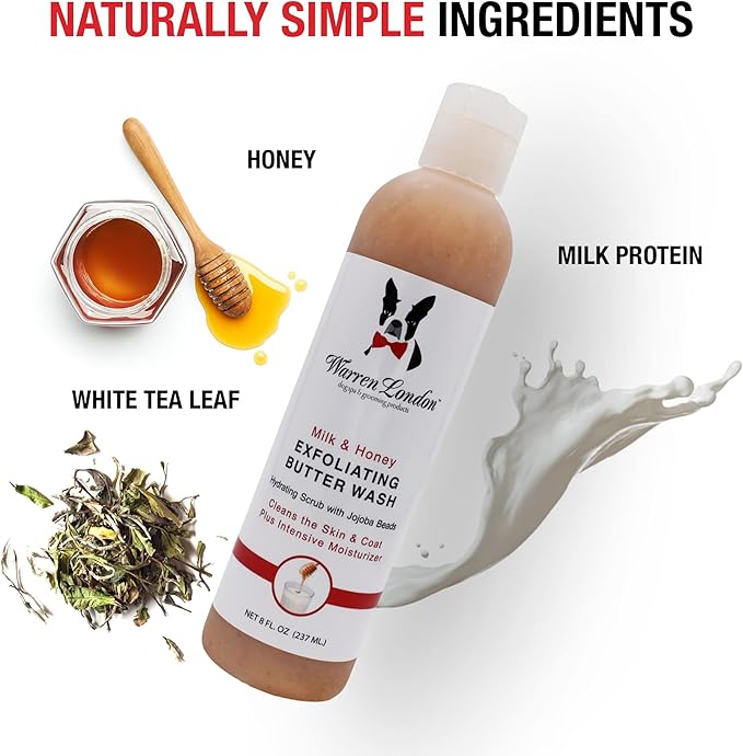 Warren London Exfoliating Butter Wash – Milk & Honey Dog Shampoo, 8 oz | Cleans, Exfoliates & Deep-Conditions in One | Jojoba Beads Remove Dandruff & Itch | Non-Oily Shine | Made in USA