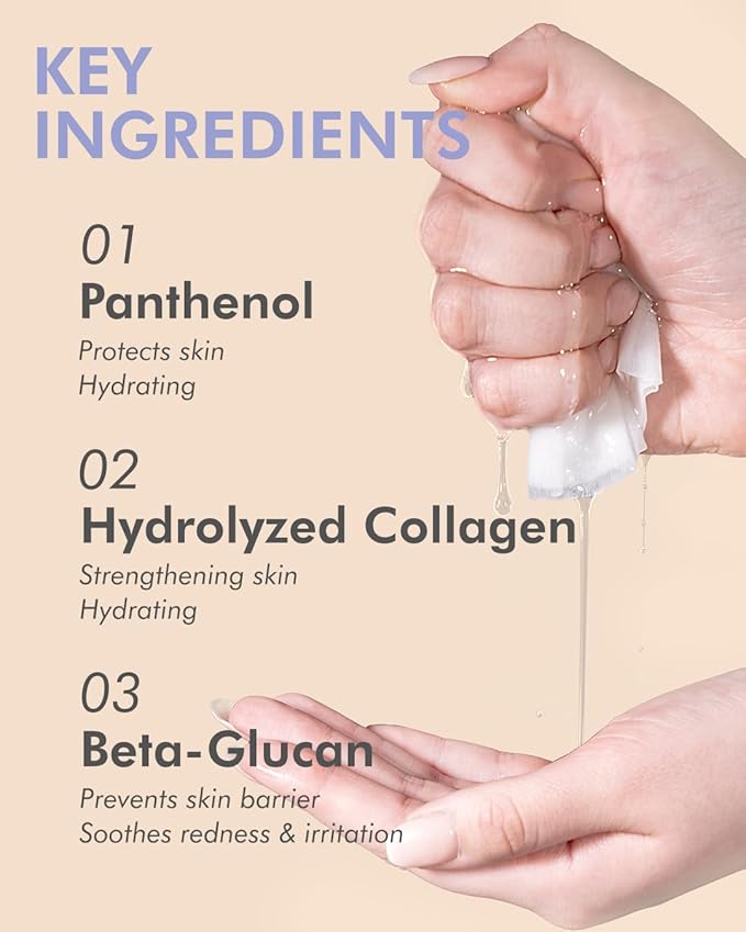- POWERFUL SKIN NOURISHMENT: Experience the potent combination of hydrolyzed collagen (2,000 ppm), vitamin E, panthenol, and beta-glucan. Together, these ingredients deeply nourish the skin, leaving it soft and resilient against daily stressors.