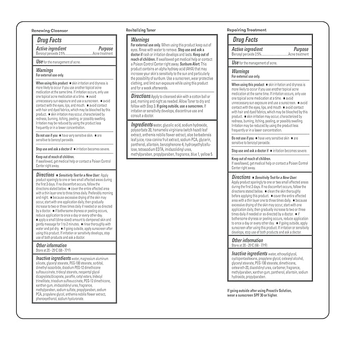 - This kit includes: Proactiv Solution Renewing Cleanser, 2 FL. OZ. ; Proactiv Solution Revitalizing Toner, 2 FL. OZ. ; Proactiv Solution Repairing Treatment, 1 FL. OZ.