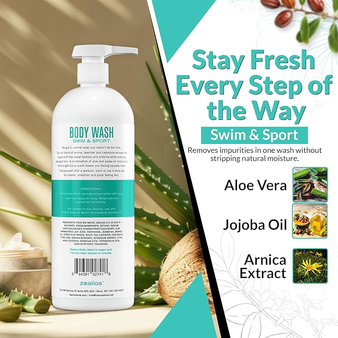 Zealios Swim & Sport Body Wash for Swimmers & Athletes 32oz Skin Care Solution for Men & Women, Removes Chlorine, Sweat & Odor, Provides Cleansing and Hydration from Pool Chemicals, Light Citrus Scent