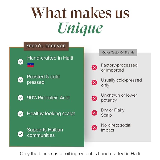 - MADE WITH LOVE FROM HAITI – Our Haitian Black Castor Oil is an organic product extracted using a traditional method that includes roasting, grinding and cooking the castor seeds. This unrefined process helps to retain a rich, strong flavor and color that is true to its natural state. Unrefined oils are always darker in color and richer in scent. 100% PURE - HEXANE FREE & SOLVENT FREE.