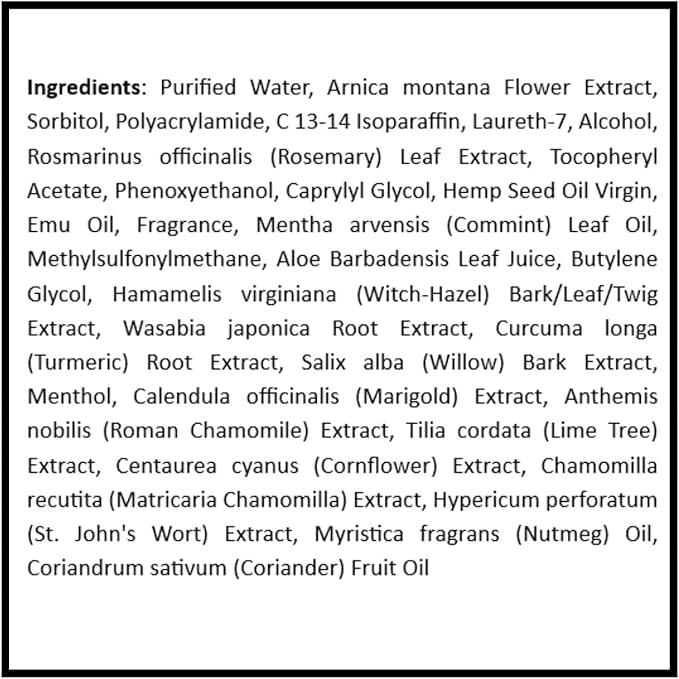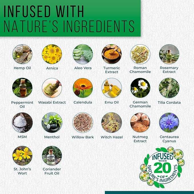 - ๐ฟ ๐ฑ% ๐๐ฟ๐ป๐ถ๐ฐ๐ฎ + ๐ฎ๐ฌ ๐ก๐ฎ๐๐๐ฟ๐ฎ๐น ๐๐ป๐ด๐ฟ๐ฒ๐ฑ๐ถ๐ฒ๐ป๐๐ ๐ณ๐ผ๐ฟ ๐๐ฒ๐ฒ๐ฝ ๐๐ผ๐บ๐ณ๐ผ๐ฟ๐: Real Time Pain Relief Hemp Oil Plus features a high 5% concentration of Arnica and a blend of 20 carefully selected natural ingredients like Hemp Oil, Turmeric, Wasabi, Menthol, Nutmeg, and Aloe Vera. Ideal for those seeking a nature-inspired solution for everyday wellness