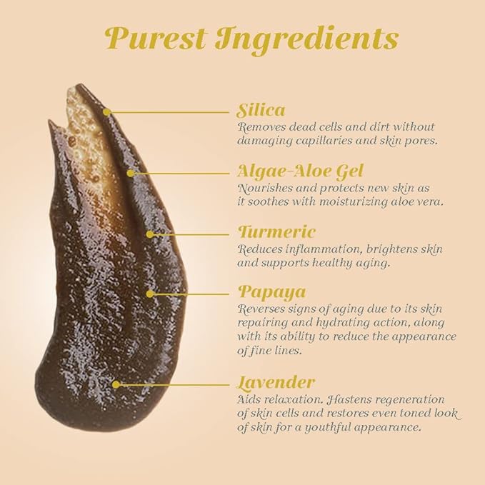 - Active Ingredients : Ultra-fine Silica Crystals, Algae-aloe Gel, Turmeric
