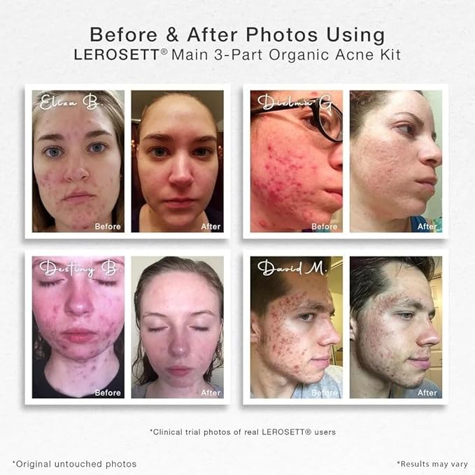 - 🌱 Gentle. Plant-Based Acne Kit: LEROSETT works differently. This 3 part skin care system works to manage acne, breakouts, blemishes, and blackheads. Our chemical-free spot treatment & clay mask helps to quickly clear breakouts; the acne cleanser uses 60% calming aloe vera gel, and the moisturizer matte is lightweight, oil & shine-free. —Vegan. Professional-Grade. Cruelty-Free.