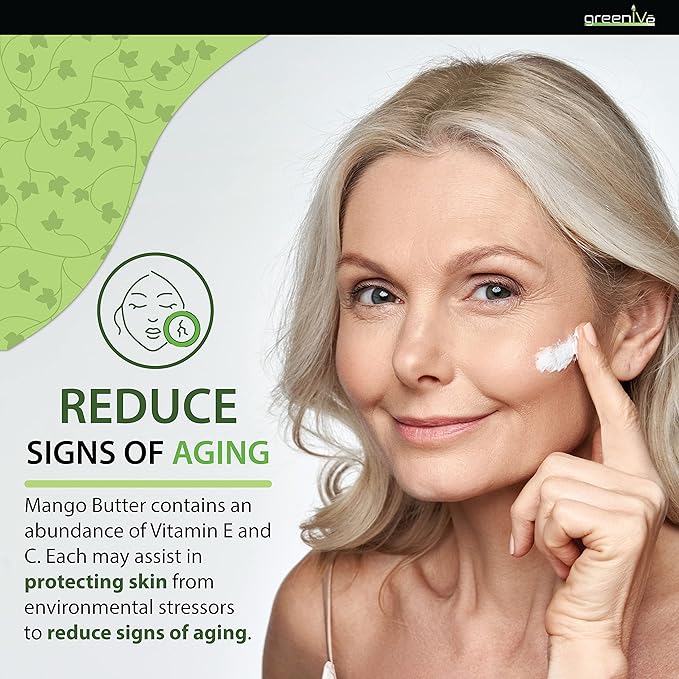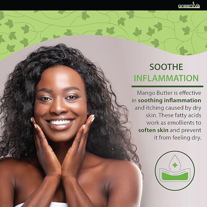 - DEEP HYDRATING MOISTURIZER FOR DRY SENSITIVE SKIN & HAIR: Unlock the ultimate natural raw mango butter benefits with GreenIVe Deodorized Mango Butter, a 100% pure unrefined creamy formula rich in vitamins A, C, D, E, and essential fatty acids that intensely nourishes parched skin, restores elasticity, and combats aging signs like fine lines and wrinkles; perfect as a daily face moisturizer, body lotion base, or hair conditioner, reduce flakes, and promote silky soft locks without greasiness.