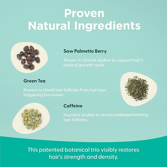 - PROMOTES FULLER-LOOKING HAIR - This formula has green tea, caffeine, and saw palmetto berry, ingredients that fight the effects of dihydrotestosterone (DHT). Excess DHT in the scalp is a main culprit for hair loss.