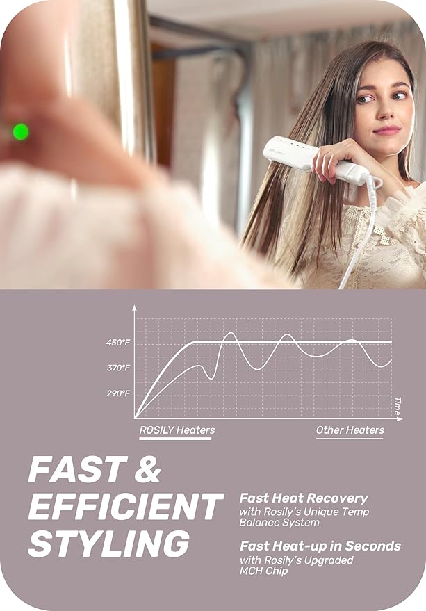 - 30s Instant Heat Up, Extra-Wide 1.75’’ Extra-Long 4.75’’ Plate for Short and Long Hair - The new advanced Metal Ceramic Heater (MCH) ensures a rise to 450°F in 30 seconds and provides continuous and stable temps throughout styling making it more efficient than PTC and Tourmaline straighteners. The extra-large plates straighten long hair faster than any other flat irons.