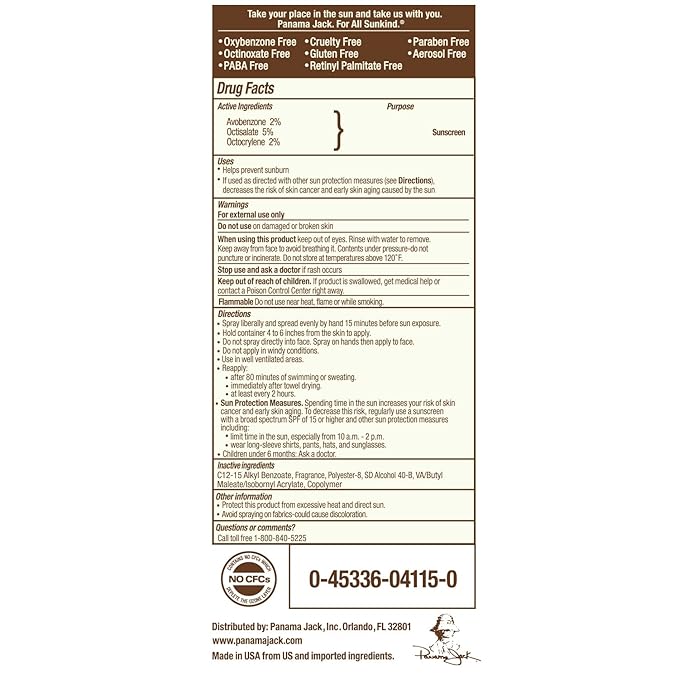 - MULTI-ACTION FORMULA: Our Panama Jack continuous SPF 15 sunscreen spray delicately combine antioxidants with moisturizing oils and a tropical fragrance in an Oxybenzone and Octinoxate Free, Broad Spectrum UVA/UVB formula