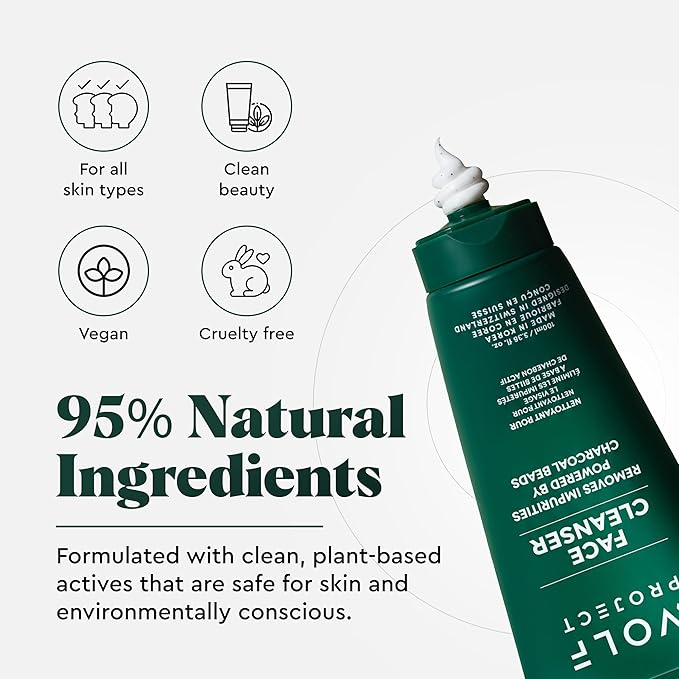 Wolf Project Activated Charcoal Beads Korean Face Wash - Charcoal Face Cleanser with Oil Control Prevents Acne, Deeply Cleanses, Hydrates and Moisturizes Skin. Natural Facial Cleanser