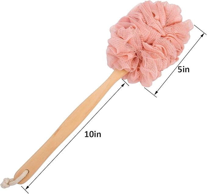 Loofah Back Scrubber for Shower, Wooden Long Handle Bath Sponge Lufa Shower Brush, Soft Nylon Mesh Back Cleaner Washer, Women & Men Exfoliating Luffa Pouf on a Stick for Body (Pink)