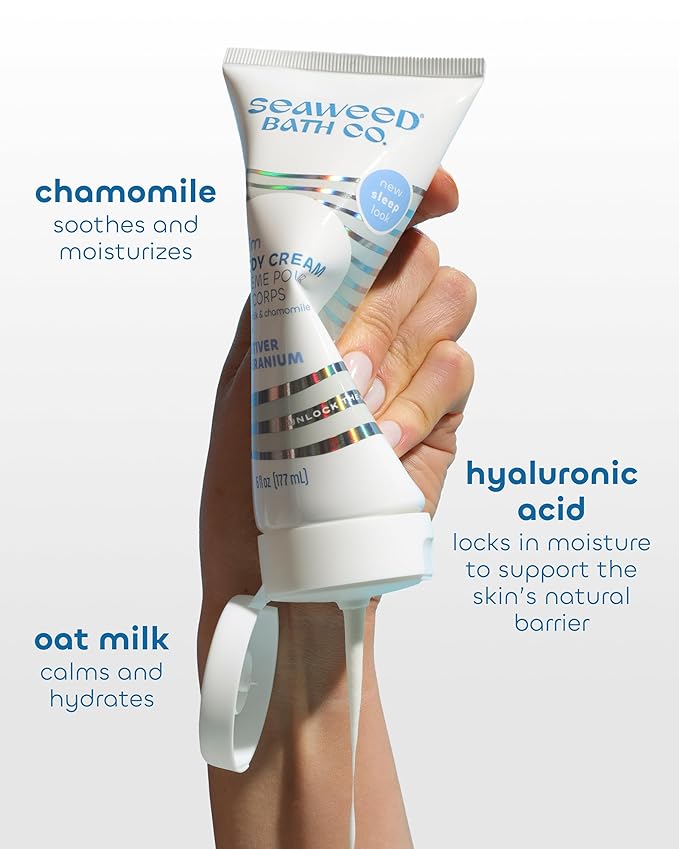 - Soothing Moisturizing Cream: With soothing oat milk, chamomile, and sustainably harvested seaweed, this relaxing body cream gently hydrates &restores skin while promoting a better night’s sleep.