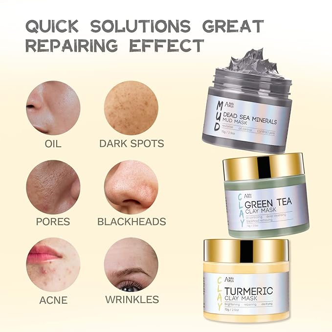 - STOCKING STUFFERS FOR WOMEN--ANAI RUI clay mask set for face with natural and clean ingredients for all skin types ! Perfect for face mask gift set. With Turmeric VC Face Mask, Green Tea Face Mask, Dead Sea Mud Mask 3 in 1 clay mask kit .70g each bottle .Our face masks skincare gift set is not only a perfect skincare gift option but also an ideal self-care treat for anyone seeking a rejuvenating skincare experience