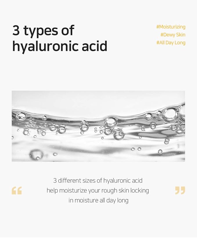 - 3 HYALLRONIC ACIDS: 3 layers of hyaluronic acid replenishes moisture deep into the skin, prevents moisture loss from the skin surface, and forms a moisture barrier to hydrate and protect your skin.