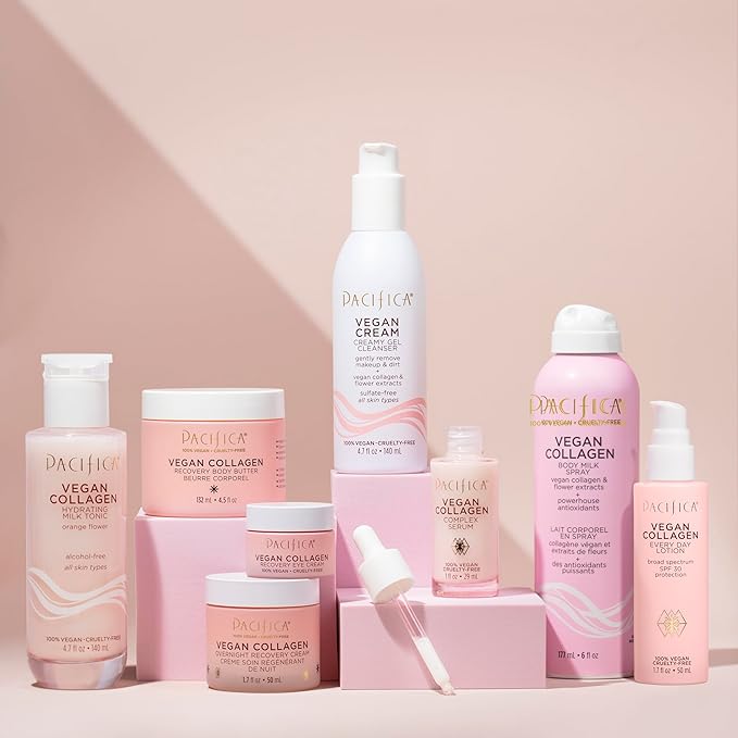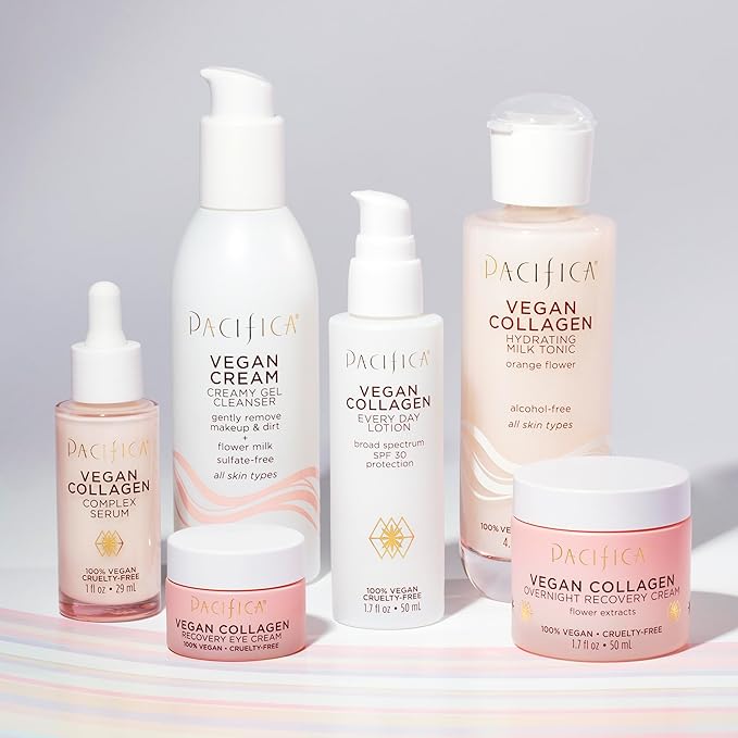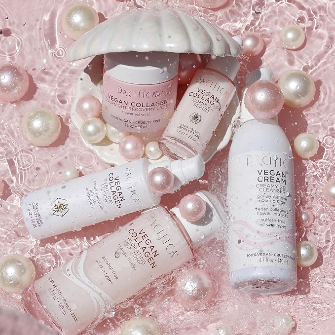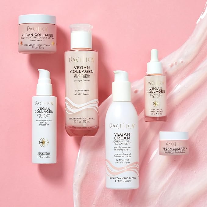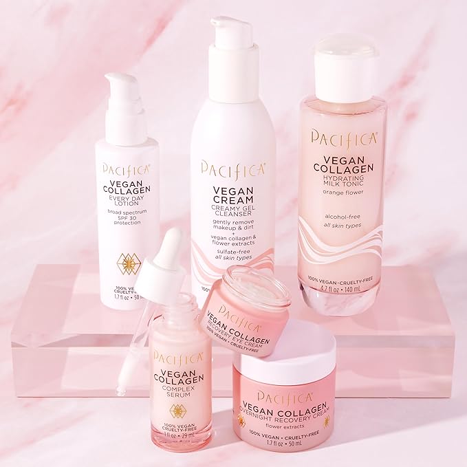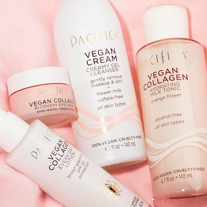 - Hydrating Vegan Collagen Cleanser β Gently washes away makeup, oil, and impurities while replenishing moisture. Enriched with vegan collagen to help boost elasticity and anti-aging benefits, this foaming facial cleanser promotes a plump, youthful-looking complexion with every wash.
