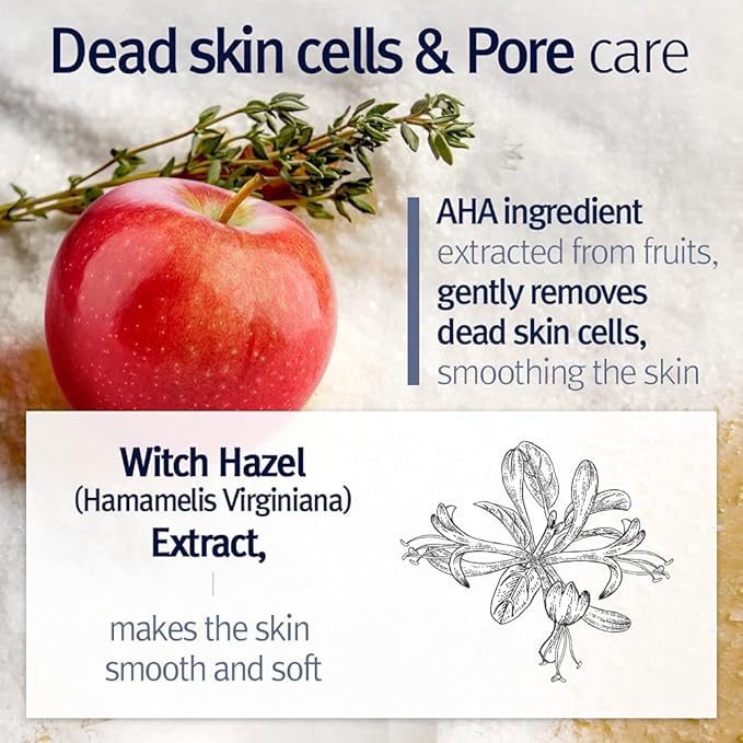 - CARE FOR DEAD SKIN CELLS AND PORES - AHA ingredients which stands for Alpha Hydroxy Acid derived from natural fruits gently cares dead skin cells to become smooth and soft. Witch Hazel's astringent effect that tights the loosen pores, skin is left softer and healthier looking.