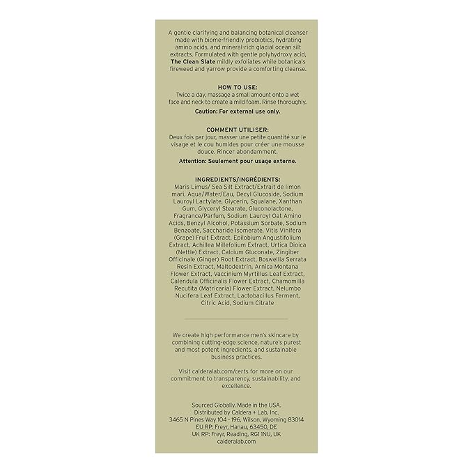 Caldera + Lab The Clean Slate | Men's Organic Foaming Facial Cleanser for Dry, Sensitive, & Normal Skin – Vegan, Natural & Antioxidant Packed Exfoliating Face Wash