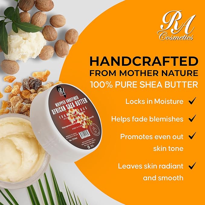 - Deep Skin Moisturizer: Packed with nourishing fatty acids, our whipped shea butter is a moisture powerhouse, renewing and replenishing from within for a smoother, softer, and healthier appearance. It swiftly hydrates, heals dry skin, evens tone, reduces blemishes, prevents stretch marks and shields your skin against UV rays.
