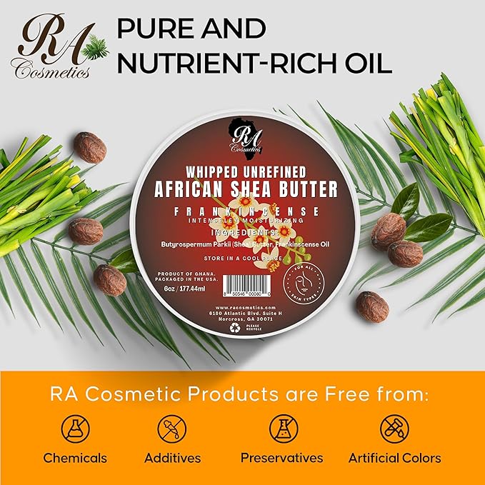 RA COSMETICS Whipped Shea Butter Frankincense - 6oz | 100% Pure & Natural African Shea Butter for Men & Women - Handcrafted Moisturizer with Essential Vitamins for Softer Lips, Healthier Skin & Hair