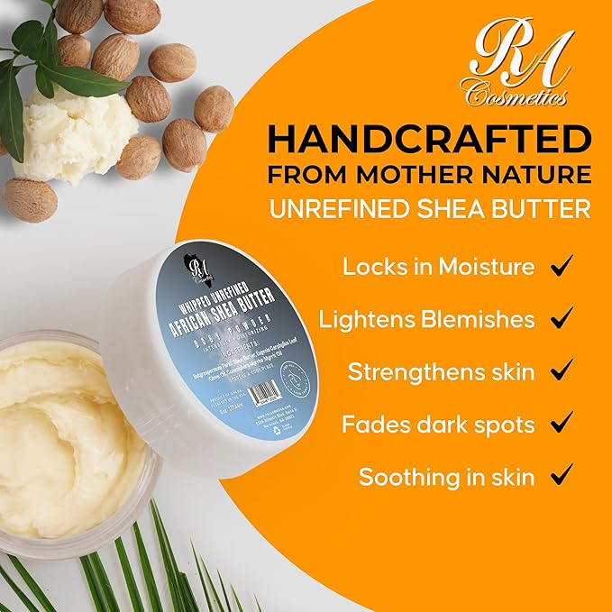 - Deep Skin Moisturizer: Packed with nourishing fatty acids, our whipped shea butter swiftly hydrates, heals dry skin, evens tone, reduces blemishes and prevents stretch marks. It shields against UV rays, soothes dryness, and enhances elasticity for soft, clear, supple skin. Safe for all skin types, including babies.