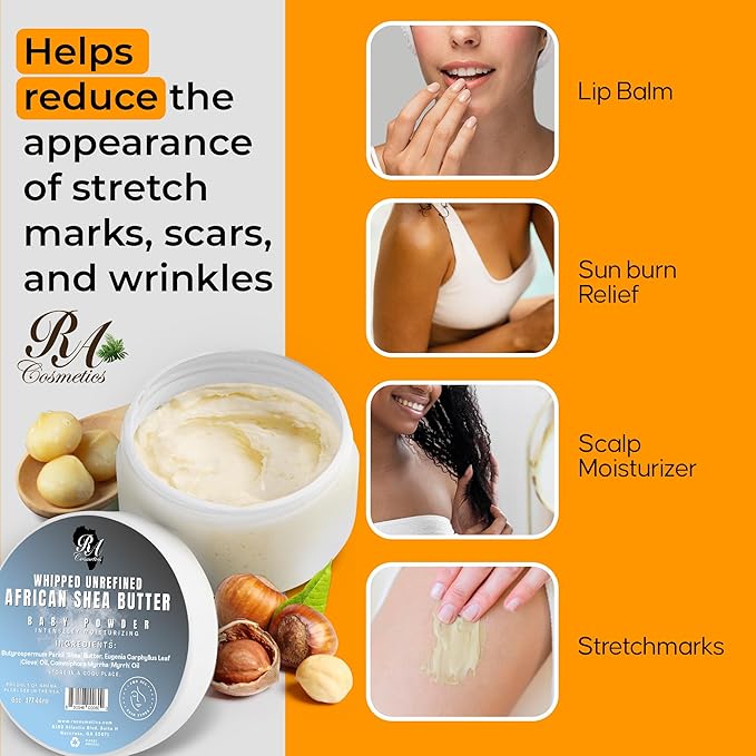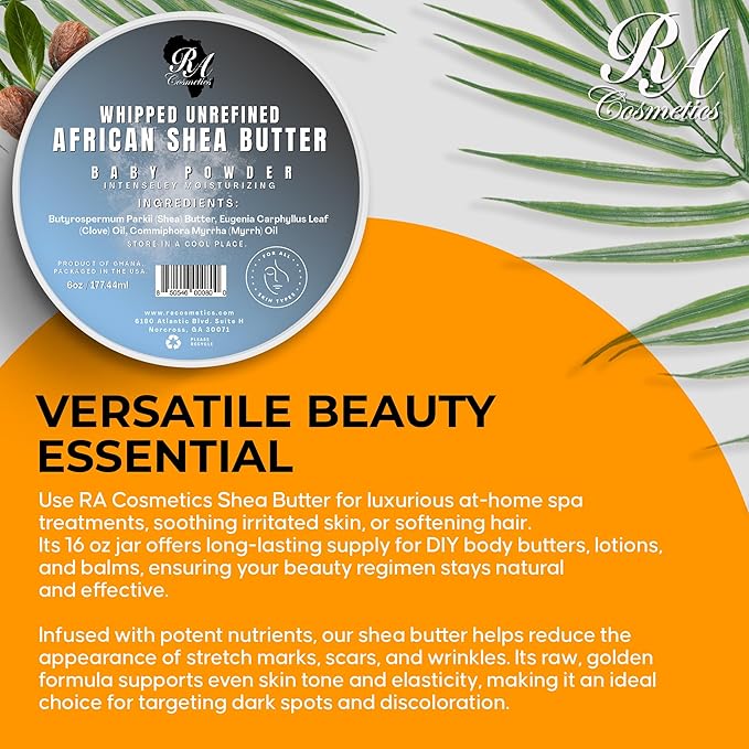 RA Cosmetics Whipped Shea Butter Baby Powder - 6oz | 100% Pure & Natural African Shea Butter for Men & Women - Ultimate Handcrafted Moisturizer with Essential Vitamins for Radiant Skin & Luscious Hair