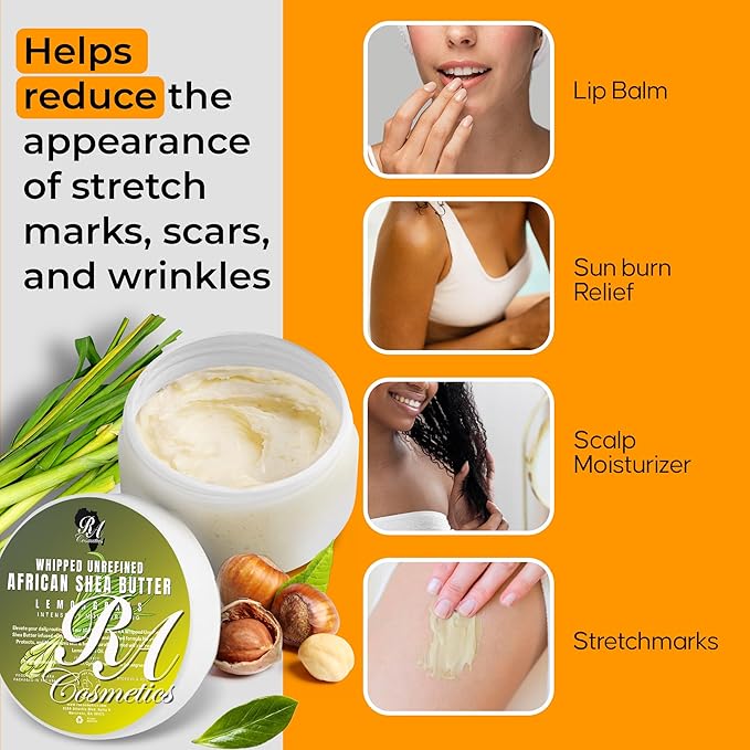 - Premium Whipped Shea Butter: Enjoy the luxurious feel of RA Cosmetic's 100% African Shea Butter, expertly handcrafted in Ghana, West Africa. This whipped Lemongrass-infused shea butter provides an ultimate skin moisturizing experience, leaving you feeling pampered from head to toe.