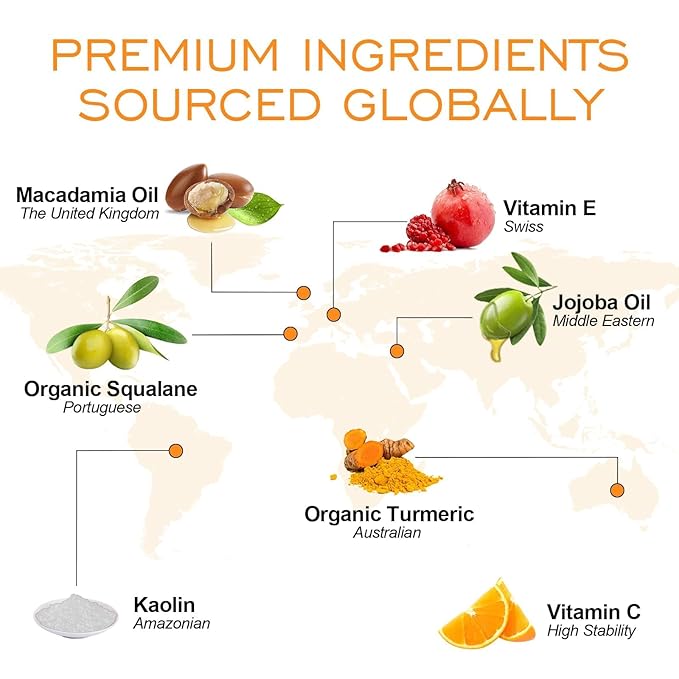 - Global Premium Ingredients for Healthy Skin Care: Features Australian organic turmeric, Amazonian kaolin clay, Portugal organic squalane, Israel jojoba oil, Swiss vitamin E, and cold-pressed aloe vera for a safe, nourishing, no dry patch clay Mask