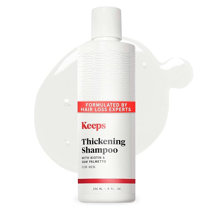 - Thickening Shampoo for Men: Better hair is just a rinse away with Keeps Thickening Shampoo. Our shampoo is formulated to make thinning hair look thicker and fuller. It also works great to complement and enhance results of male hair loss treatment. Includes one 8 oz bottle.