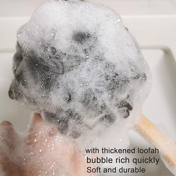 Shower Sponge Loofah Back Scrubber, Soft Mesh Body Scrubber with Wooden Handle, Bath Sponge for Women Kids (Black)