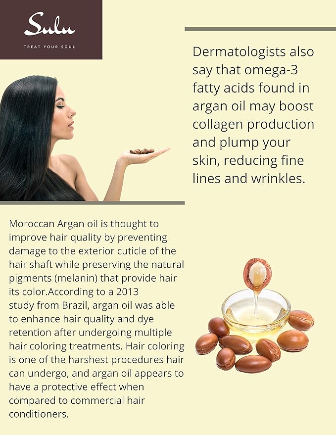 - Product Benefits : Rich in vitamin E and omega 3 and 9 fatty acids, this argan oil provides hydration and moisture to dry and damaged hair, improving its shine and overall health. Rich in vitamin E and omega 3 and 9 fatty acids, this argan oil provides hydration and moisture to dry and damaged hair, improving its shine and overall health.