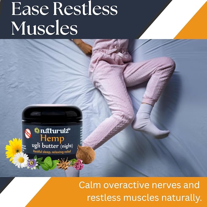 - SOOTHING NIGHTLY HEMP FORMULA: Melatonin free & Specificially formulated to ease tension, soothe restless muscles, calm charley horses & muscle spasms Ugli Butter Nighttime is ideal for nightly use on a sore neck, shoulder tension, back discomfort, twitchy legs, muscle cramps, and hip soreness. Nighttime Hemp is a calming, relaxation topical helpful for those who deal with nightly restlessness.
