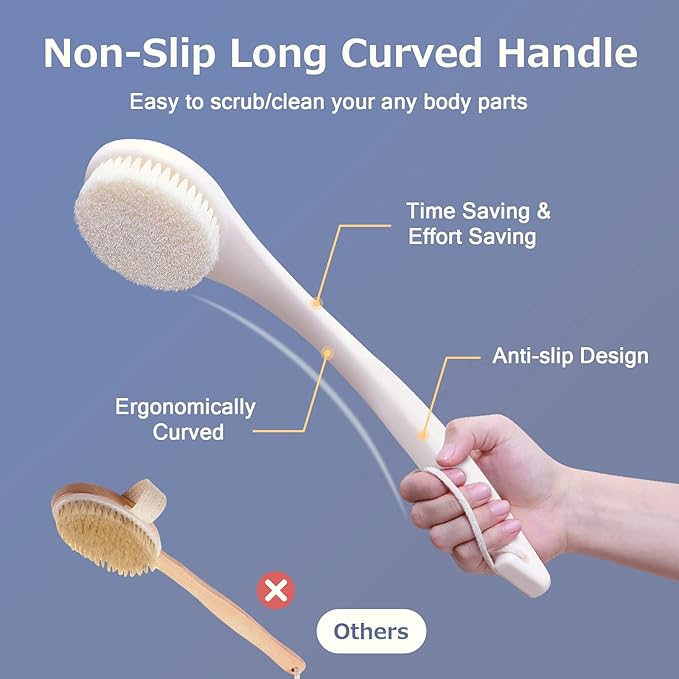 - 🛀【MODERATE BRISTLES】After testing various bristle types, we selected those that strike a balance between firm and soft, catering to the majority's needs while ensuring durability. Using this exfoliating back scrubber brush helps remove dead skin, old skin cells, and unclogs pores, leaving your skin smoother and more breathable, while also enhancing blood circulation.