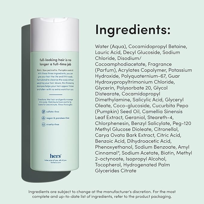 - hers Triple Threat shampoo helps control hair shedding by strengthening and moisturizing hair with biotin, saw palmetto, and pumpkin seed oil