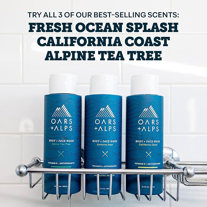 - Oars + Alps Body and Face Wash is infused with Vitamin E and Antioxidants for a deeply hydrating and moisturizing clean. This set includes 3 delightfully fresh and not overpowering scented body washes: Fresh Ocean Splash, California Coast and Alpine Tea Tree. Free from Parabens, Phthalates, Sulfates and Gluten. Vegan and Animal Cruelty-free.