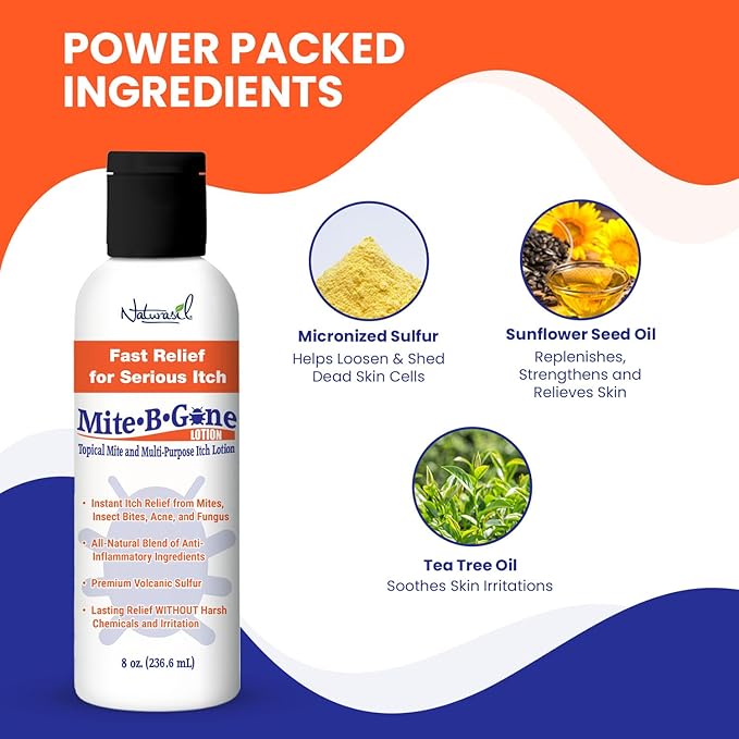 - Mite-B-Gone Lotion gives you lasting relief WITHOUT harsh chemicals or irritation