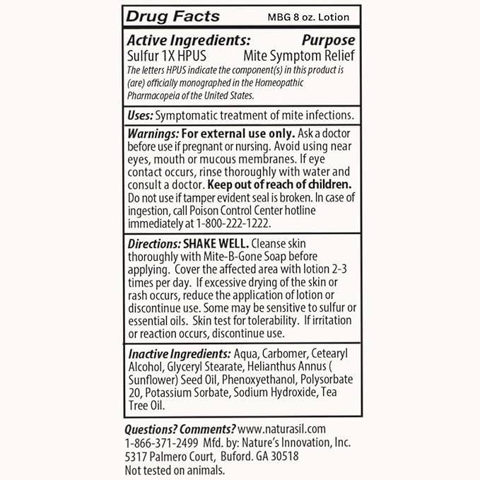 - Product Benefits : Mite-B-Gone's lotion is a 100% Natural Formula that includes Sunflower Seed Oil and Tea Tree Oil, a known soothing and anti-inflammatory blend, which works quickly to counteract itching and progressively clear up any discomfort. Mite-B-Gone's lotion is a 100% Natural Formula that includes Sunflower Seed Oil and Tea Tree Oil, a known soothing and anti-inflammatory blend, which works quic⦠See more