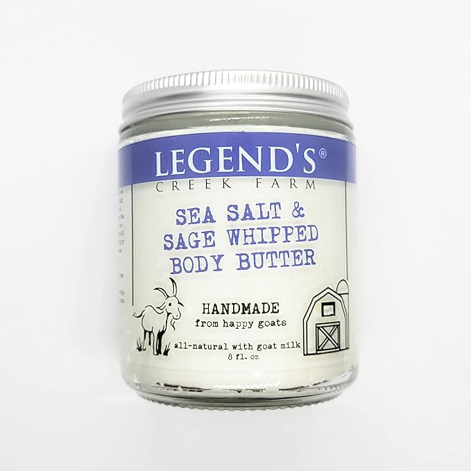 Legend's Creek Farm, Goat Milk Body Butter - Hydrating Natural Body Moisturizer with Organic Shea Butter & Grape Seed Oil - 8 Oz Purifying & Toning Whipped Body Butter (Sea Salt & Sage)