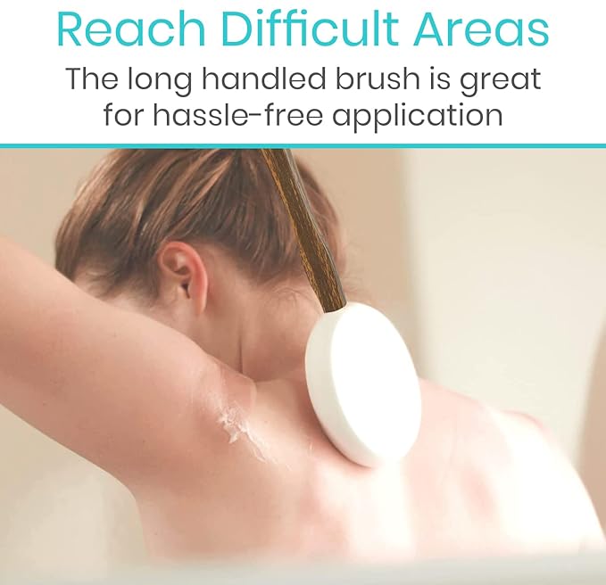 - EFFORTLESS SELF-APPLICATION: Get even coverage of lotions, creams, gels, and more with the Vive lotion applicator. It’s perfect for use on your back and feet. Say goodbye to awkward bending and twisting with its 17.5” handle and 3.5” applicator pad.