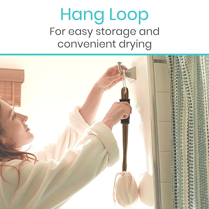 - EXTENDED REACH NON-SLIP HANDLE: The 17.5” curved handle is made of durable lotus wood and features a textured rubber grip for a comfortable and secure hold. The handle's cord loop allows for easy hanging storage or can be worn on your wrist while applying products.