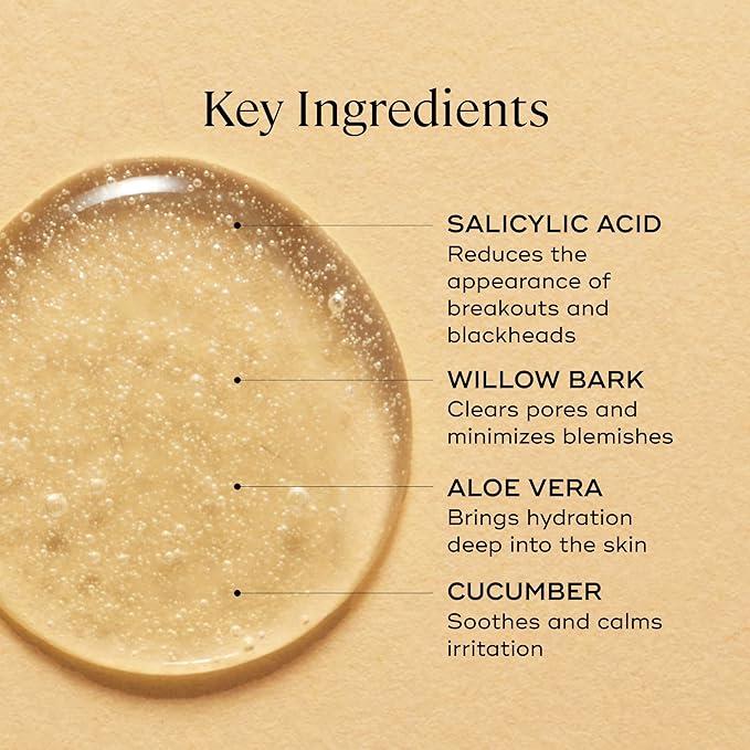 - Salicylic Acid + Willow Bark help to exfoliate and reduce breakouts, blackheads, and blemishes for a clearer complexion.