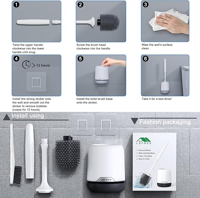 - Easy to install - Easy to put together. You can set the toilet scrubber on the wall with a sticker or place it on the floor as a freestanding toilet bowl brush.