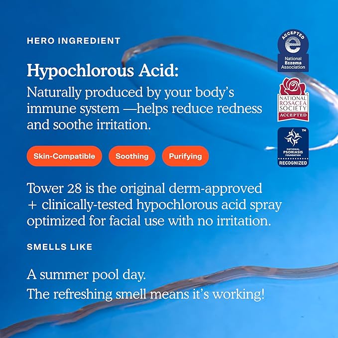 - THE ORIGINAL HYPOCHLOROUS ACID FACIAL SPRAY: This formula, known as Tower 28 SOS Facial Spray, is backed by clinical research and dermatologist testing, helping reduce the appearance of breakouts, calm visible irritation, and soothe redness
