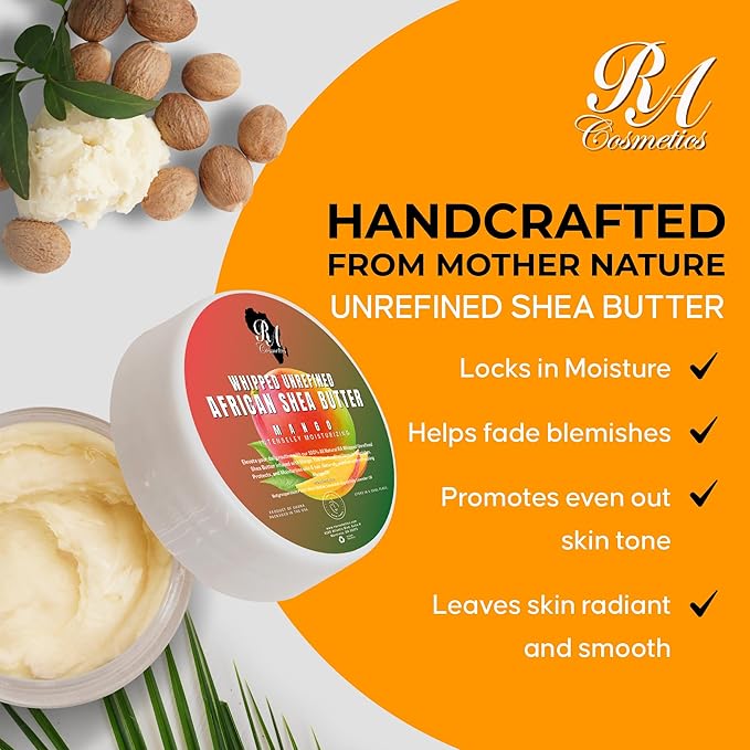 - Premium Whipped Shea Butter: Enjoy the luxurious feel of RA Cosmetic's 100% African Shea Butter, expertly handcrafted in Ghana, West Africa. This whipped mango-infused shea butter provides an ultimate skin moisturizing experience, leaving you feeling pampered from head to toe.