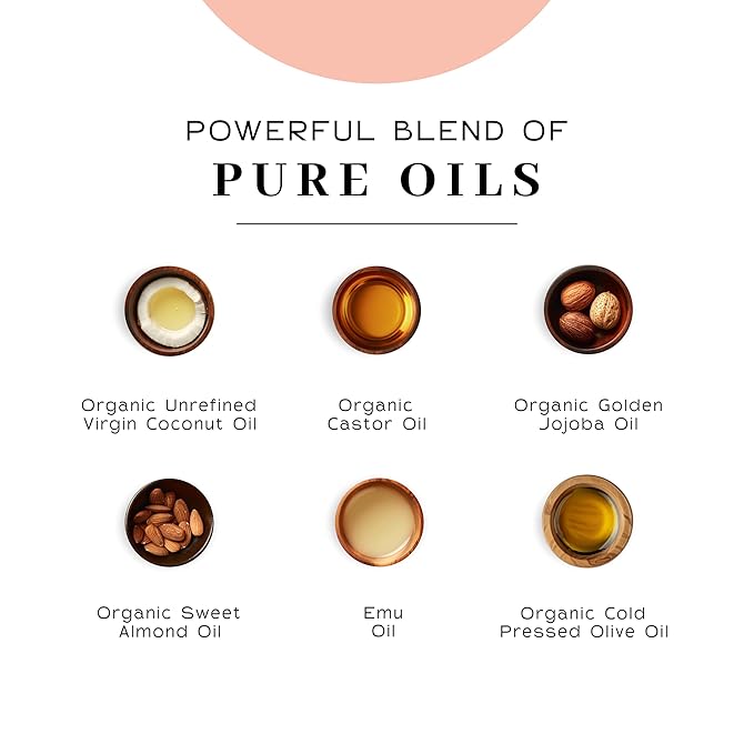 - Powerful Blend of Pure Oils - This hair serum is a potent mix of castor oil and coconut oil for hair, including almond, olive, emu, and jojoba oil; it's an idea oil for hair growth and damaged hair that needs a boost of hydration and strength