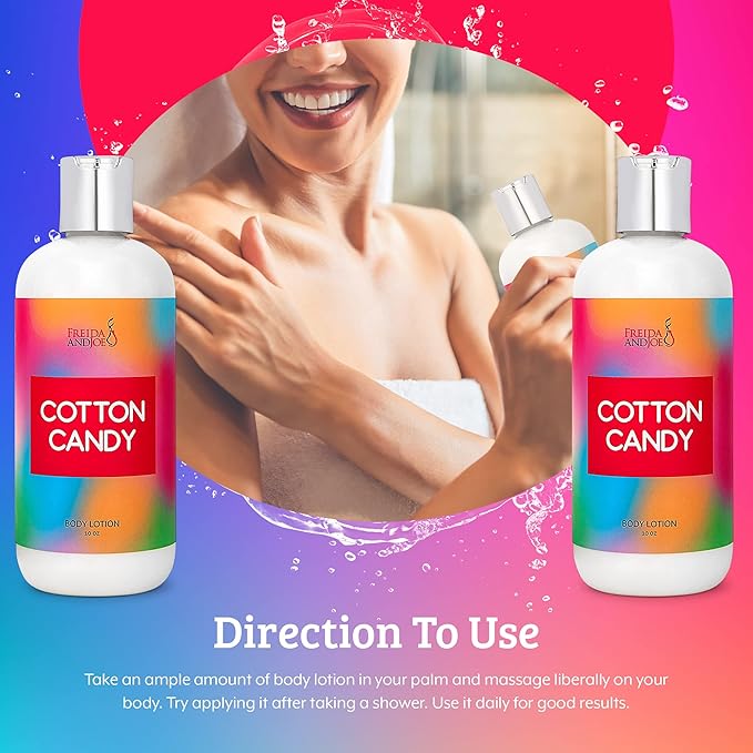 - LIGHTWEIGHT MOISTURIZATION - Frieda & Joe Cotton Candy non-greasy moisturizer leaves skin feeling silky and smooth and smells good enough to eat. This light lotion moisturizes skin and is a perfect alternative to heavy perfumes. Our quick-absorbing and softening formula will have your skin silky-smooth in no time.