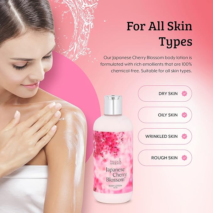 - DRY SKIN NOURISHMENT - Our Frieda & Joe Japanese Cherry Blossom scented body moisturizer transports hydration deep into the skin's surface to help heal any sign of cracked or dry skin, leaving you feeling soft and supple.
